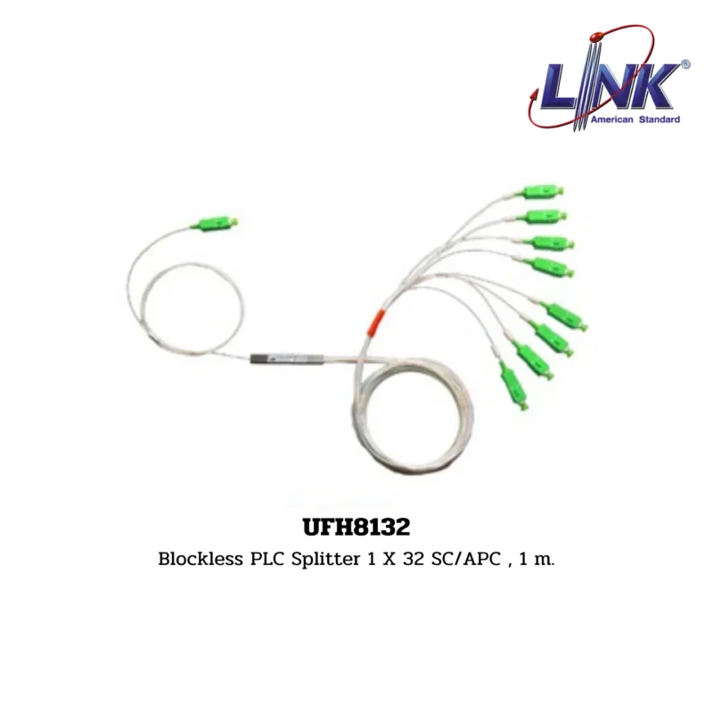 สินค้า Blockless PLC Splitter 1 X 32 SC/APC รหัส UFH8132 จากแบรนด์ LINK คือตัวแยกสัญญาณไฟเบอร์ออปติกแบบ Planar Lightwave Circuit (PLC) ชนิด Blockless (ไม่มีกล่องหุ้มภายนอก) ทำหน้าที่แยกสัญญาณไฟเบอร์จาก 1 Core ออกเป็น 32 Core (1×32) ใช้สำหรับติดตั้งในระบบ FTTx/PON ที่ต้องการการกระจายสัญญาณจำนวนมาก มาพร้อมคอนเน็กเตอร์ชนิด SC/APC ที่เข้าปลายสายเรียบร้อยแล้ว