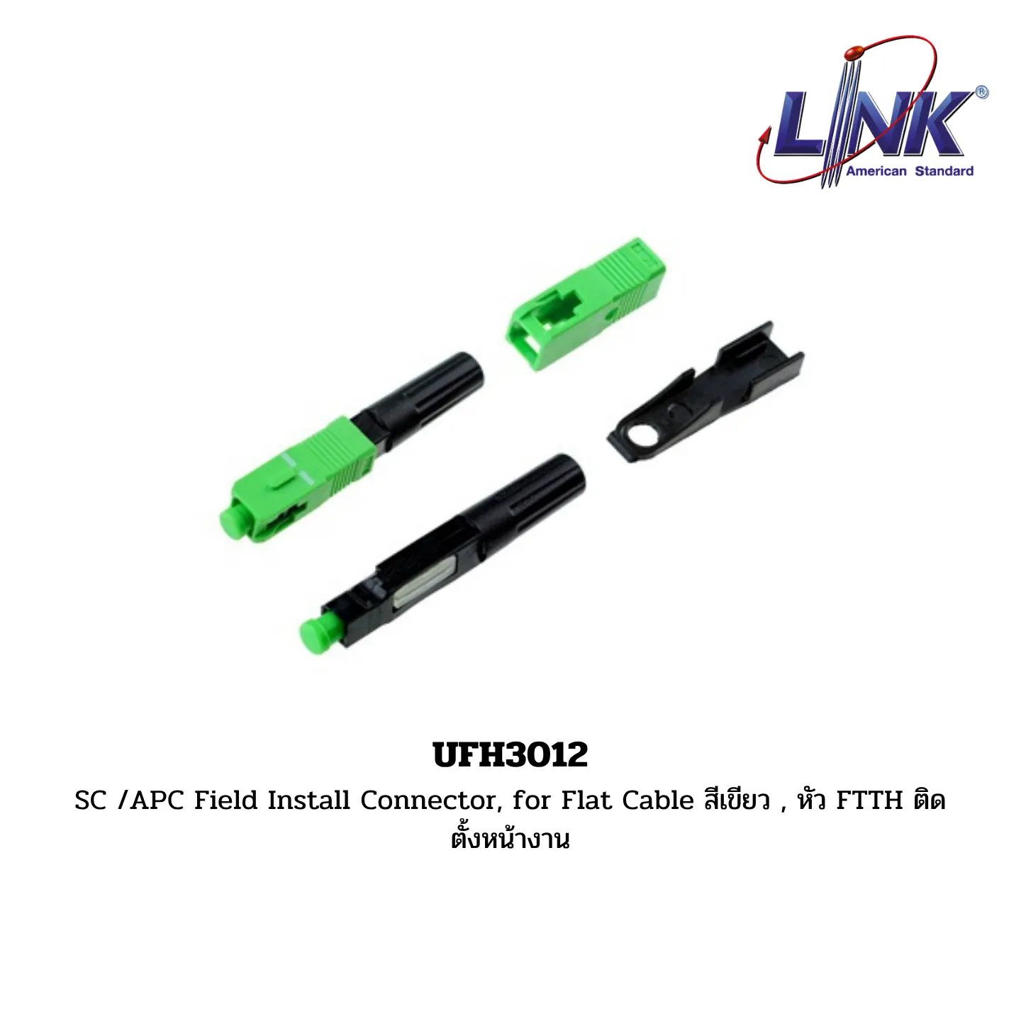 สินค้า SC /APC Field Install Connector, for Flat Cable รหัส UFH3012 จากแบรนด์ LINK คือหัวคอนเน็กเตอร์ไฟเบอร์ออปติกชนิด ติดตั้งหน้างาน (Field Install Connector) ออกแบบมาเพื่อใช้สำหรับการเข้าหัวสายไฟเบอร์ออปติกในระบบ FTTH/FTTx ที่ใช้สายชนิด Flat Drop Cable โดยเฉพาะ ตัวคอนเน็กเตอร์เป็นชนิด SC/APC ซึ่งมีตัวเรือนเป็น สีเขียว