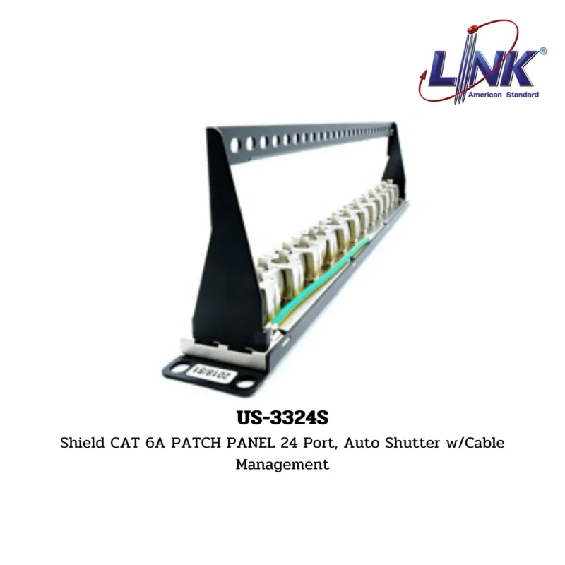 Overview: The US-3324S Shield CAT 6A Patch Panel, featuring 24 ports, auto shutter mechanism, and cable management, is designed for high-performance network connectivity. This patch panel is part of the CAT 6A SHIELD CONNECTORS range under the LAN (UTP) System and the CAT 6A SUPER XG Patch Panel & Connector sub-range by LINK.