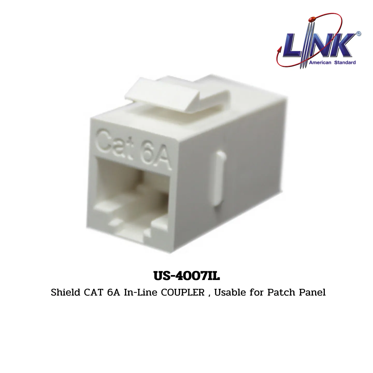 Overview: The US-4007IL Shield CAT 6A In-Line Coupler is designed to provide secure and high-performance network connectivity. This coupler is suitable for use with patch panels and is part of the CAT 6A UNSHIELD CONNECTORS SUPER S SERIES range under the LAN (UTP) System and the CAT 6A SUPER XG Patch Panel & Connector sub-range by LINK.