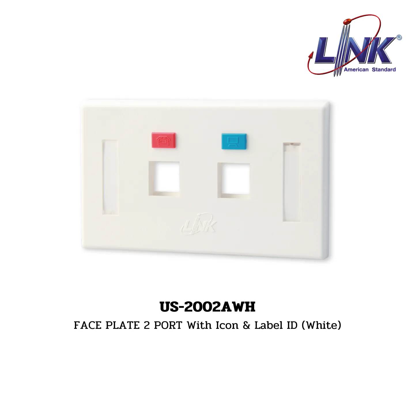 Overview: The US-2002AWH Face Plate, featuring two ports with icon and label ID and a white finish, is designed to provide a neat and professional appearance for network and electrical installations. This face plate is part of the FACE PLATE, WALL BOX, CHANGER sub-range under the LAN (UTP) System by LINK.