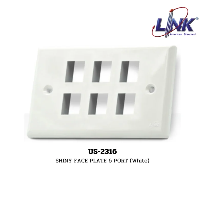 Overview: The US-2316 Shiny Face Plate, featuring six ports and a white finish, is designed to provide a neat and professional appearance for network and electrical installations. This face plate is part of the FACE PLATE, WALL BOX, CHANGER sub-range under the LAN (UTP) System by LINK.