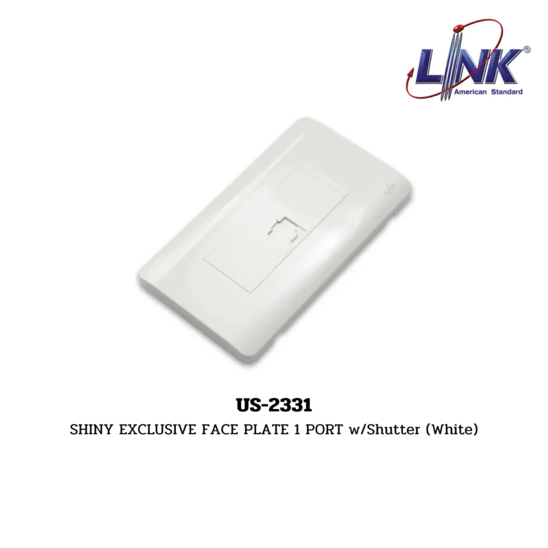 Overview: The US-2331 Shiny Exclusive Face Plate, featuring a single port with shutter and a white finish, is designed to provide a neat and professional appearance for network and electrical installations. This face plate is part of the FACE PLATE, WALL BOX, CHANGER sub-range under the LAN (UTP) System by LINK.