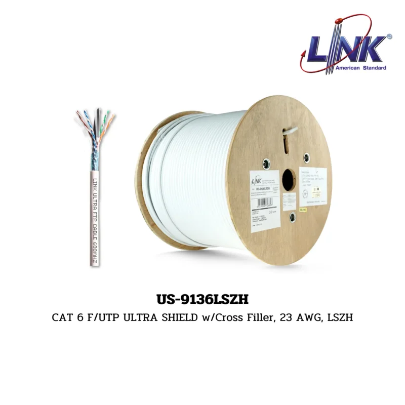 Overview: The US-9136LSZH CAT 6 F/UTP Ultra Shield Cable with Cross Filler and a 23 AWG size, featuring LSZH (Low Smoke Zero Halogen) jacketing, is designed for robust and reliable network connectivity in industrial and residential environments. This cable is part of the OPTION CABLE for Used with INDUSTRIAL & BROADCAST Solution range under the LAN (UTP) System and the INDUSTRIAL & RESIDENCE LAN SOLUTION sub-range by LINK.