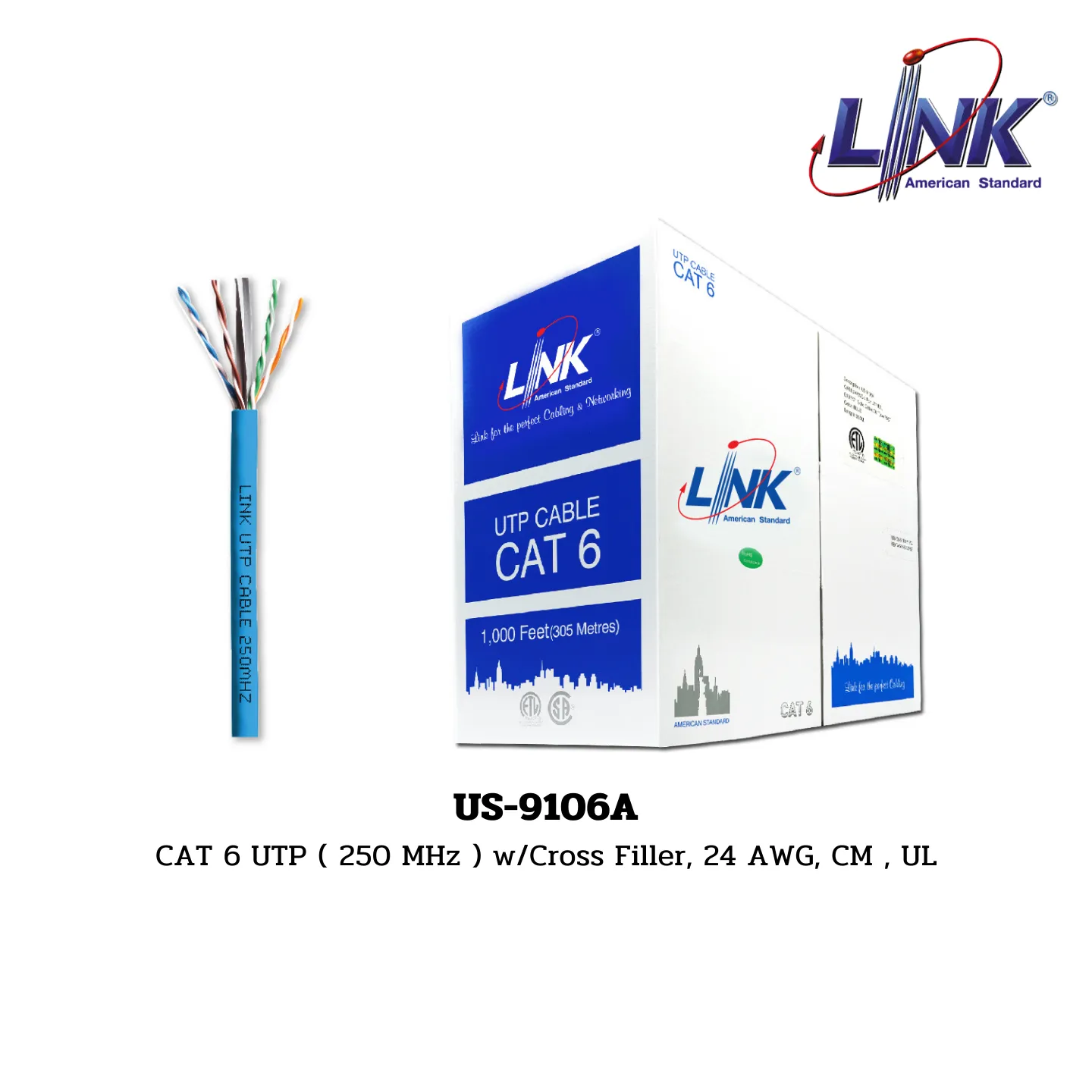 Overview: The US-9106A CAT 6 UTP Cable, designed for enhanced performance at 250 MHz, features cross filler for improved structural integrity, 24 AWG size, and is CM and UL certified for improved safety. This cable is part of the INDOOR (UL Sticker) range under the LAN (UTP) CAT 6 600 MHz sub-range by LINK.