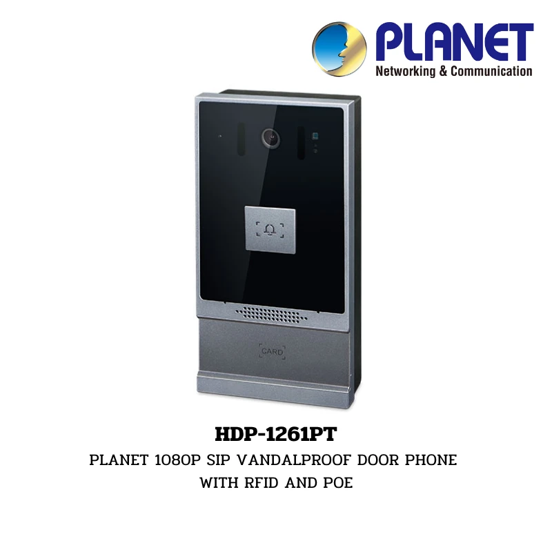 Planet HDP-1261PT เป็นอุปกรณ์อินเตอร์คอมหน้าประตูอัจฉริยะ (SIP Door Phone) ที่มีความทนทานสูงระดับ Vandalproof ออกแบบมาเพื่อระบบรักษาความปลอดภัยและการควบคุมการเข้า-ออกอาคารยุคใหม่ มาพร้อมกล้องความละเอียด 1080p Full HD มุมมองกว้างถึง 120 องศา และไฟส่องสว่างอินฟราเรด (IR) ที่มองเห็นได้ไกลถึง 5 เมตรในที่มืดสนิท รองรับการเข้า-ออกด้วยบัตร RFID ทั้งความถี่ 125KHz และ 13.56MHz (IC Card) เก็บข้อมูลผู้ใช้งานได้สูงถึง 10,000 ราย ตัวเครื่องรองรับมาตรฐาน PoE และสามารถทำงานได้ในสภาพแวดล้อมที่รุนแรงตั้งแต่อุณหภูมิ -40 ถึง 70 องศาเซลเซียส เหมาะสำหรับการติดตั้งหน้าอาคาร สำนักงาน หรืออพาร์ตเมนต์ที่ต้องการความปลอดภัยระดับสูงสุด
