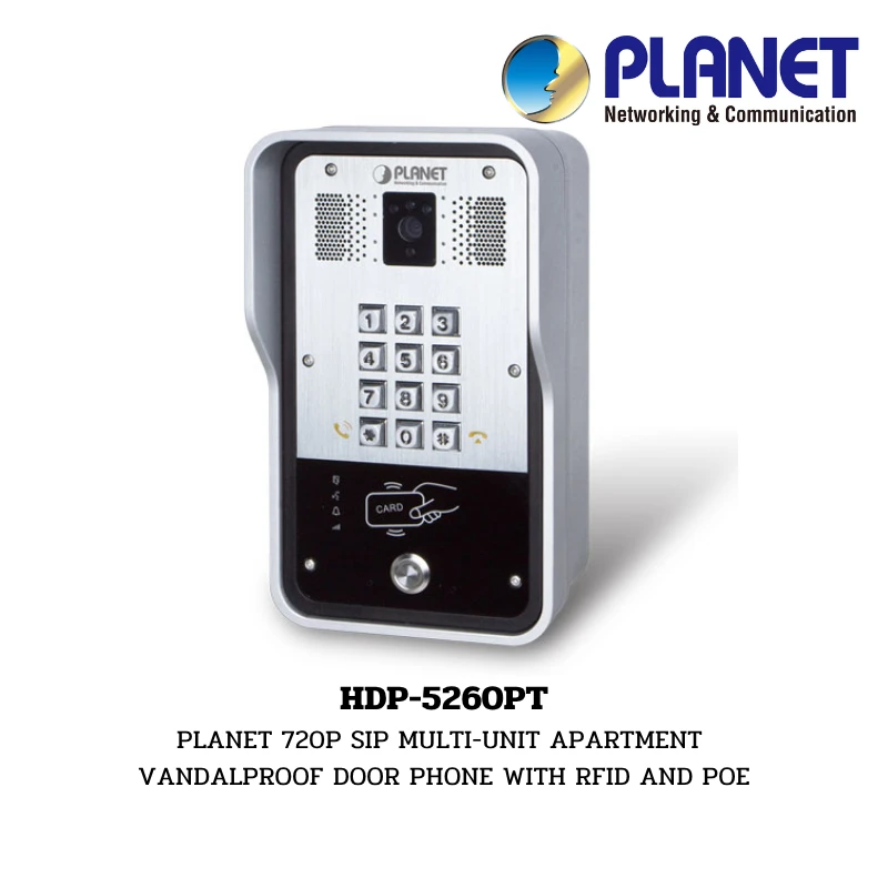 Planet HDP-5260PT เป็นอุปกรณ์อินเตอร์คอมหน้าประตูอัจฉริยะแบบหลายยูนิต (Multi-unit) ที่ออกแบบมาเพื่อใช้งานในอาคารชุด อพาร์ตเมนต์ หรือสำนักงานขนาดใหญ่ ตัวเครื่องมีความทนทานสูงระดับ Vandalproof มาพร้อมกล้องความละเอียด 720P (1280 x 760) และไฟส่องสว่าง White LED 3 ดวงที่ช่วยให้มองเห็นใบหน้าผู้ติดต่อได้ชัดเจนในระยะ 5 เมตรแม้ในสภาวะแสงน้อย รองรับการเข้า-ออกด้วยบัตร RFID ทั้งความถี่ 125KHz และ 13.56MHz โดยเก็บข้อมูลบัตรได้สูงสุดถึง 5,000 ใบ มีปุ่มกดตัวเลขมาตรฐาน 12 ปุ่มช่วยให้ผู้มาติดต่อสามารถกดหมายเลขห้องเพื่อสนทนากับผู้อยู่อาศัยได้โดยตรงผ่านระบบ SIP