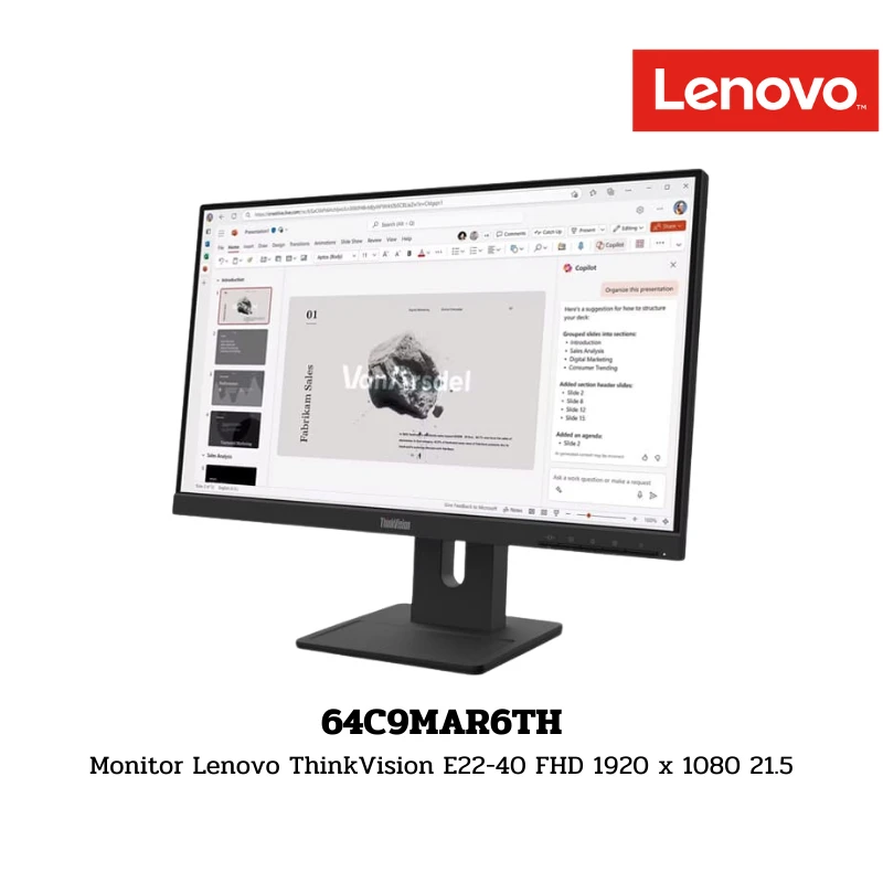ThinkVision E22-40 เป็นจอมอนิเตอร์ขนาด 21.5 นิ้ว ที่ออกแบบมาเพื่อรองรับการใช้งานในระดับมืออาชีพอย่างเต็มตัว ด้วยพาเนล IPS ที่ให้มุมมองกว้างและสีสันแม่นยำระดับ 99% sRGB มาพร้อมอัตรารีเฟรช 100Hz ที่ช่วยให้การแสดงผลลื่นไหลยิ่งขึ้น จุดเด่นอยู่ที่ขาตั้งแบบ Full Function ที่สามารถปรับความสูง หมุนจอแนวตั้ง และปรับเอียงได้อย่างอิสระตามหลักสรีระศาสตร์ พร้อมลำโพงในตัวและพอร์ตเชื่อมต่อที่ครบครันทั้ง VGA, HDMI และ DisplayPort