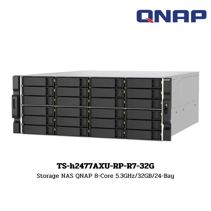 QNAP TS-h2477AXU-RP-R7-32G เป็น Storage NAS ระดับองค์กรที่ออกแบบมาสำหรับระบบจัดเก็บข้อมูลขนาดใหญ่ใน Data Center หรือองค์กรที่ต้องการพื้นที่จัดเก็บข้อมูลจำนวนมาก เช่น ระบบ Backup Server, Virtual Machine Storage, File Server และระบบ Data Archive โดยทำงานบนระบบปฏิบัติการ QuTS hero ที่ใช้ไฟล์ระบบ ZFS ซึ่งช่วยเพิ่มความปลอดภัยของข้อมูล พร้อมฟีเจอร์ Snapshot, Data Integrity และการป้องกันข้อมูลเสียหาย
