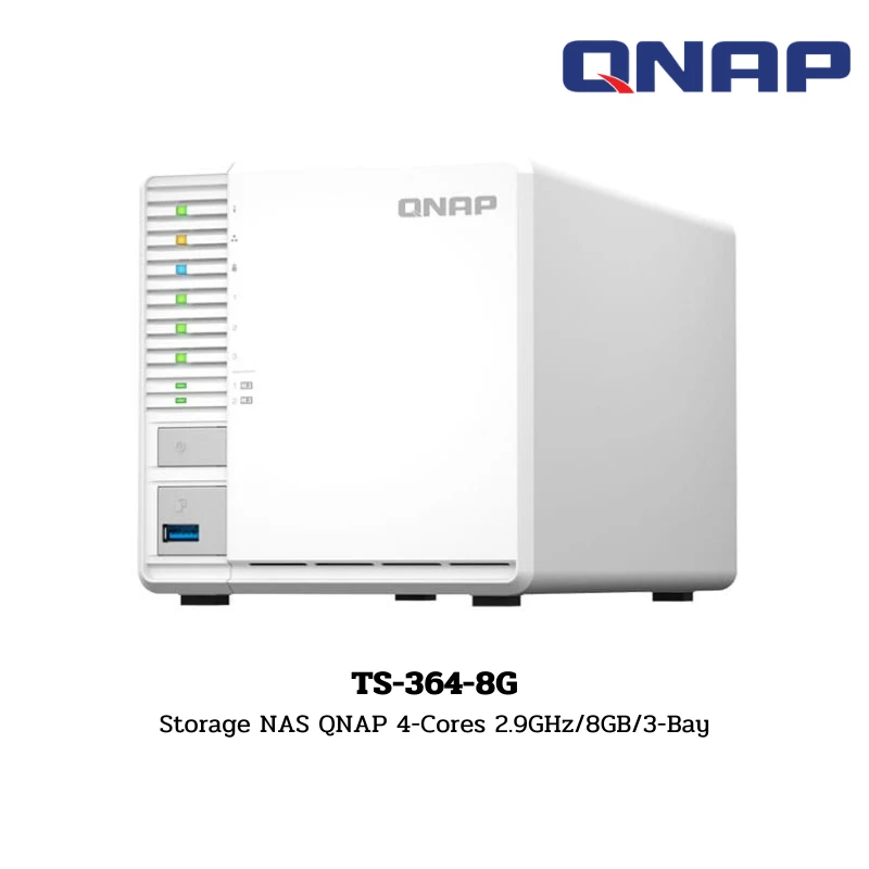 เครื่องจัดเก็บข้อมูลอัจฉริยะ (NAS) จาก QNAP รุ่น TS-364-8G มาพร้อมดีไซน์แบบ 3-Bay ที่โดดเด่น ช่วยให้ผู้ใช้สามารถสร้างระบบจัดเก็บข้อมูลแบบ RAID 5 เพื่อเพิ่มประสิทธิภาพและระบบสำรองข้อมูลที่ปลอดภัยโดยใช้ฮาร์ดดิสก์เพียง 3 ลูก ขับเคลื่อนด้วยขุมพลัง Intel® Celeron® N5095 แบบ 4-Core ความเร็วสูงสุด 2.9 GHz และหน่วยความจำขนาด 8 GB รองรับการเชื่อมต่อเครือข่ายความเร็วสูง 2.5GbE และมีช่องเสียบ M.2 NVMe SSD จำนวน 2 ช่อง สำหรับทำ Cache Acceleration หรือสร้าง Storage Pool ความเร็วสูง นอกจากนี้ยังรองรับการแสดงผลผ่าน HDMI 2.0 (4K) เหมาะสำหรับโฮมออฟฟิศที่ต้องการความสมดุลระหว่างความจุ ความปลอดภัย และประสิทธิภาพ มั่นใจด้วยการรับประกัน 2 ปี