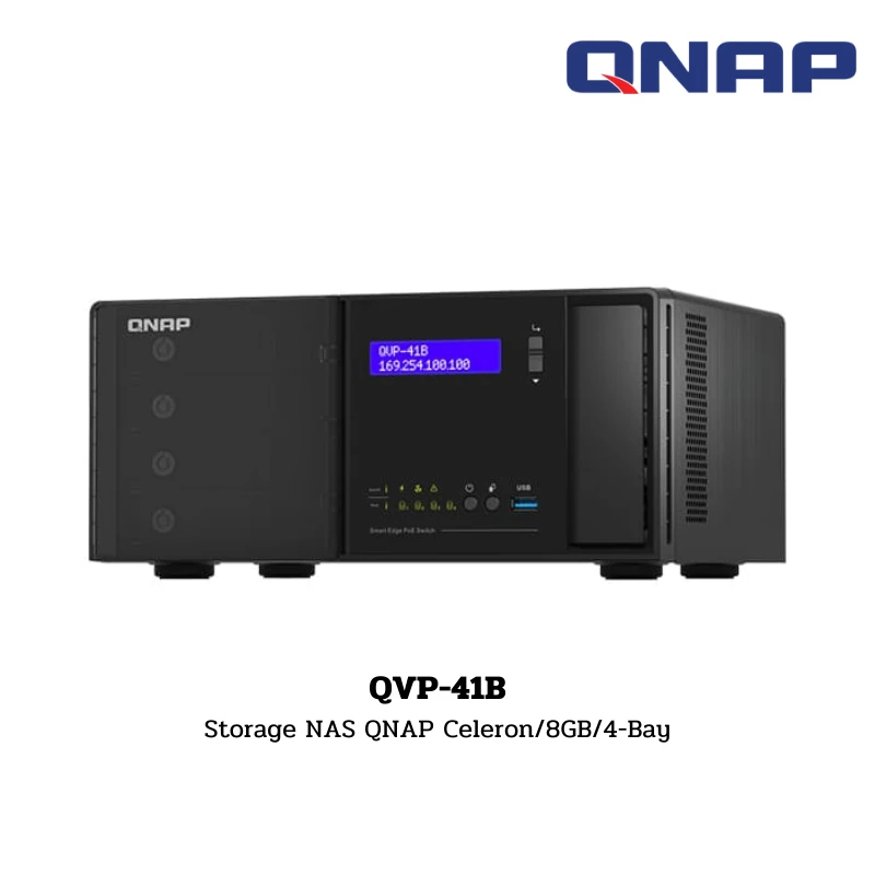 เครื่องจัดเก็บข้อมูลอัจฉริยะและเครื่องบันทึกวิดีโอเครือข่าย (NVR) จาก QNAP รุ่น QVP-41B ถูกออกแบบมาเป็นโซลูชันด้านความปลอดภัยแบบครบวงจร โดยรวมเอาความสามารถของ NAS และ Managed Switch ไว้ในเครื่องเดียว รองรับการจ่ายไฟผ่านพอร์ต PoE+ เพื่อเชื่อมต่อกับกล้อง IP Camera ได้โดยตรงโดยไม่ต้องใช้อุปกรณ์เสริม มาพร้อมประสิทธิภาพการประมวลผลจากขุมพลัง Intel และหน่วยความจำขนาด 8 GB รองรับการบันทึกข้อมูลปริมาณมากผ่านฮาร์ดดิสก์ 4 ช่อง และแสดงผลวิดีโอความละเอียดสูงผ่านพอร์ต HDMI คู่ เหมาะสำหรับธุรกิจที่ต้องการระบบเฝ้าระวังที่ทรงพลังและติดตั้งได้ง่าย มั่นใจด้วยการรับประกัน 3 years