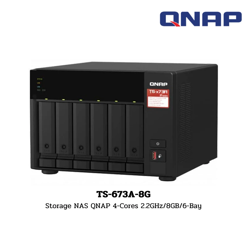 QNAP TS-673A-8G เป็นอุปกรณ์ Storage NAS แบบ Desktop ที่ออกแบบมาสำหรับองค์กรหรือธุรกิจที่ต้องการระบบจัดเก็บข้อมูลที่มีประสิทธิภาพสูง รองรับการทำงานด้าน File Server, Backup, Virtualization และระบบจัดเก็บข้อมูลขนาดใหญ่ มาพร้อมหน่วยประมวลผล AMD Ryzen Embedded V1500B แบบ 4 Core / 8 Thread ความเร็ว 2.2GHz และหน่วยความจำ 8GB DDR4 ที่สามารถอัปเกรดได้สูงสุดถึง 64GB พร้อมรองรับ ECC Memory เพื่อเพิ่มความเสถียรของระบบ รองรับการติดตั้งฮาร์ดดิสก์สูงสุด 6 Bay และรองรับการเพิ่มการ์ดเครือข่าย 10GbE ผ่าน PCIe Expansion เหมาะสำหรับองค์กรที่ต้องการระบบจัดเก็บข้อมูลที่สามารถขยายได้ในอนาคต
