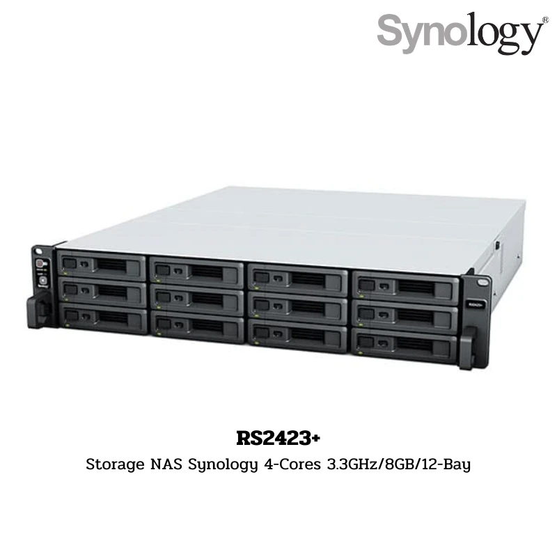 Synology RS2423+ เป็น Network Attached Storage (NAS) ระดับองค์กรแบบ Rackmount ที่ออกแบบมาเพื่อรองรับการจัดเก็บข้อมูลขนาดใหญ่ เหมาะสำหรับ Data Center, ระบบ Backup ภายในองค์กร, Virtualization Storage และระบบจัดเก็บข้อมูลสำหรับงานที่ต้องการประสิทธิภาพสูง รุ่นนี้ใช้หน่วยประมวลผล AMD Ryzen V1780B แบบ 4-Core ที่มีความเร็ว 3.35GHz (Base) และสูงสุด 3.6GHz (Turbo) ช่วยให้สามารถประมวลผลข้อมูลจำนวนมากและรองรับการทำงานหลายบริการพร้อมกันได้อย่างมีประสิทธิภาพ พร้อมหน่วยความจำ 8GB DDR4 ECC ที่ช่วยเพิ่มความเสถียรของระบบ และสามารถอัปเกรดได้สูงสุด 32GB (16GB × 2) ตัวเครื่องรองรับ Drive Bay จำนวน 12 ช่อง สำหรับติดตั้ง 3.5-inch SATA HDD หรือ 2.5-inch SATA SSD เหมาะสำหรับองค์กรที่ต้องการพื้นที่จัดเก็บข้อมูลขนาดใหญ่ พร้อมรองรับการทำ RAID เพื่อเพิ่มความปลอดภัยของข้อมูล