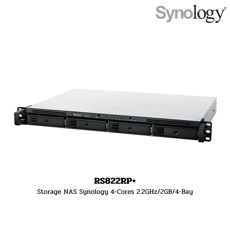 Synology RS822RP+ เป็น Network Attached Storage (NAS) แบบ Rackmount ที่ออกแบบมาสำหรับองค์กรหรือธุรกิจที่ต้องการระบบจัดเก็บข้อมูลที่มีความเสถียรสูง โดยรองรับการติดตั้งในตู้ Rack สำหรับ Data Center หรือ Server Room เหมาะสำหรับการใช้งานเป็น File Server, Backup Server, Surveillance Storage และระบบ Private Cloud ภายในองค์กร รุ่นนี้ใช้หน่วยประมวลผล AMD Ryzen V1500B แบบ 4-Core ความเร็ว 2.2GHz ที่ให้ประสิทธิภาพในการจัดการข้อมูลและการทำงานหลายบริการพร้อมกันได้อย่างมีประสิทธิภาพ พร้อมหน่วยความจำ 2GB DDR4 ECC ซึ่งช่วยลดข้อผิดพลาดของข้อมูล และสามารถอัปเกรด RAM ได้สูงสุด 32GB (16GB × 2)