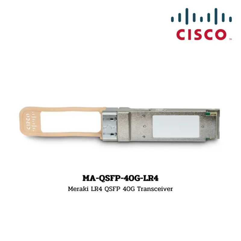 The Meraki MA-QSFP-40G-LR4 is a high-speed 40 Gigabit Ethernet (GbE) QSFP+ transceiver module designed for long-range communication over single-mode fibers.