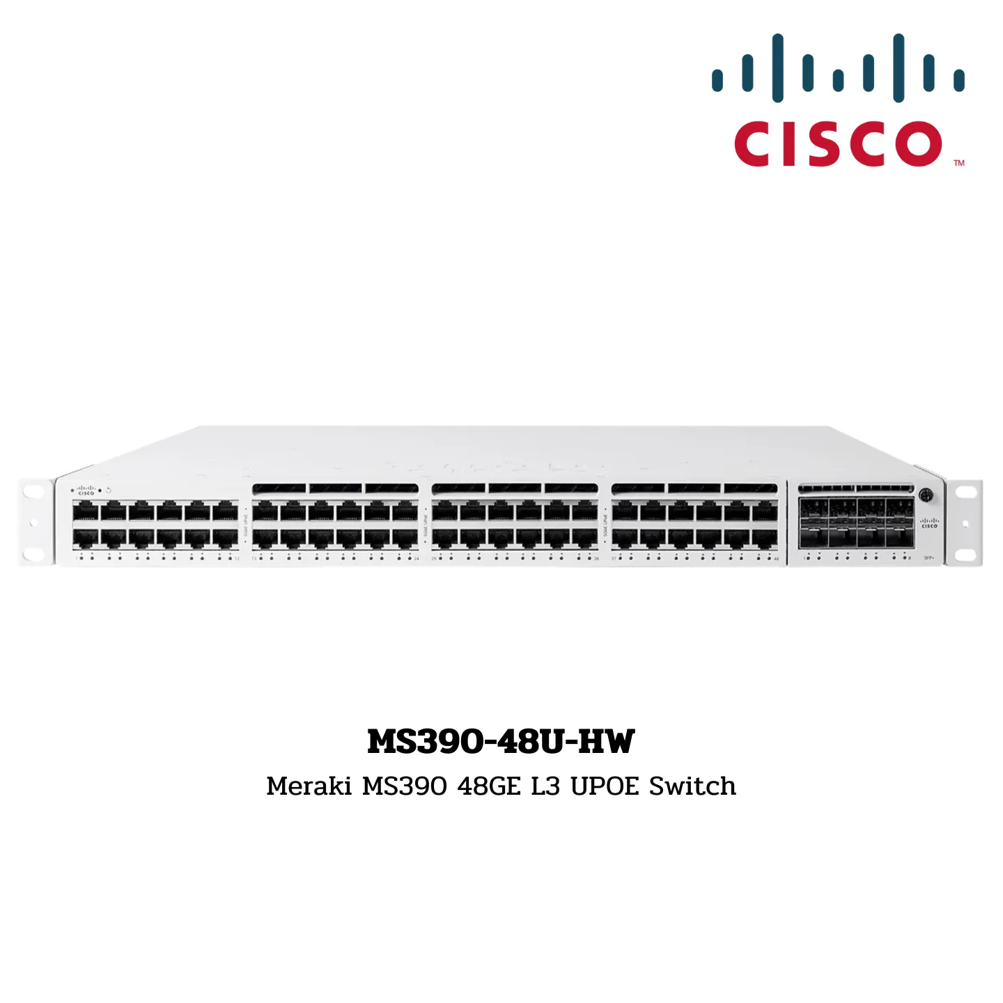 The Meraki MS390-48U-HW is a powerful 48-port Gigabit Ethernet (1GbE) Layer 3 switch with Universal Power over Ethernet (UPOE) capability, designed to meet the needs of the most demanding enterprise applications.