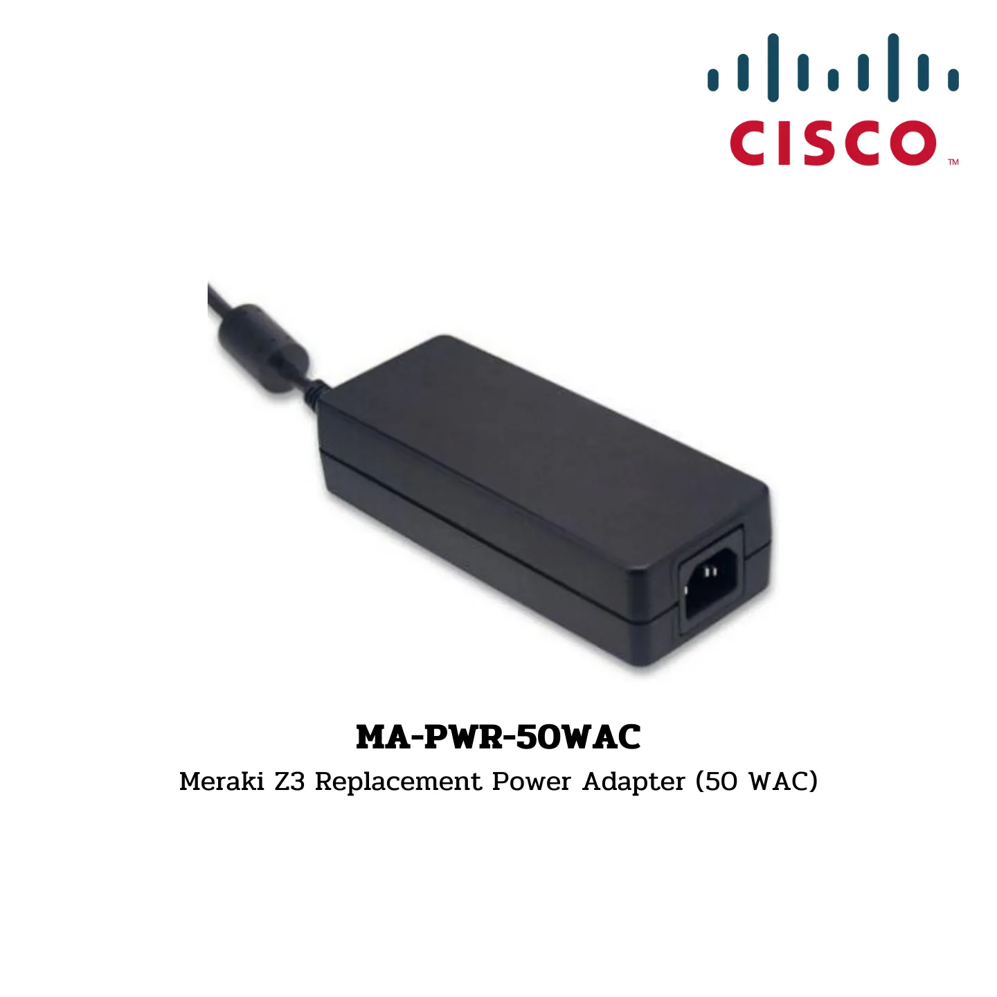 The Meraki MA-PWR-50WAC is a 50W AC power adapter designed as a replacement power supply for Meraki Z3 teleworker gateways.