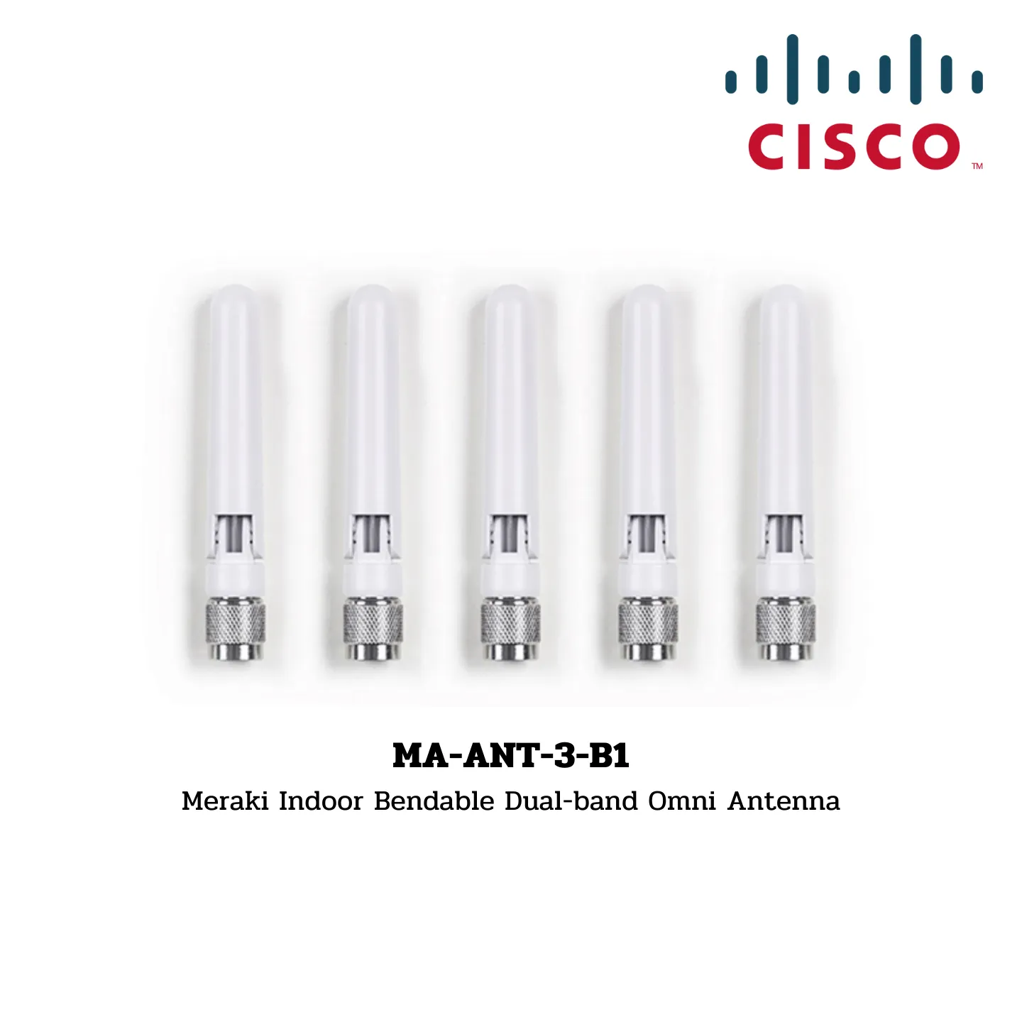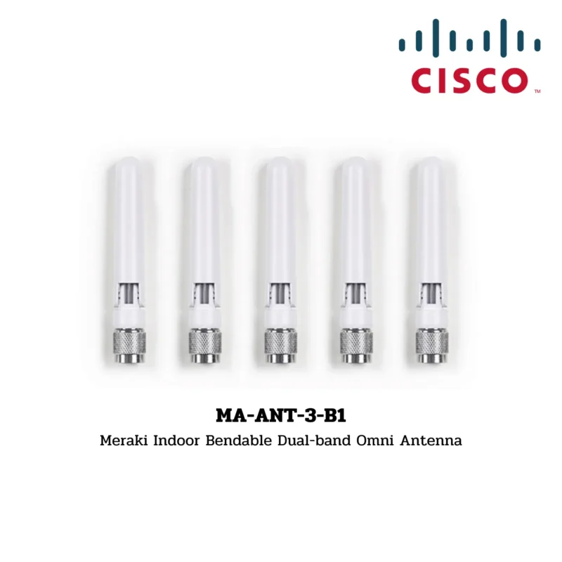The Meraki MA-ANT-3-B1 is an indoor dual-band omnidirectional antenna designed with a bendable structure, perfect for low-density deployments like schools and hotels.