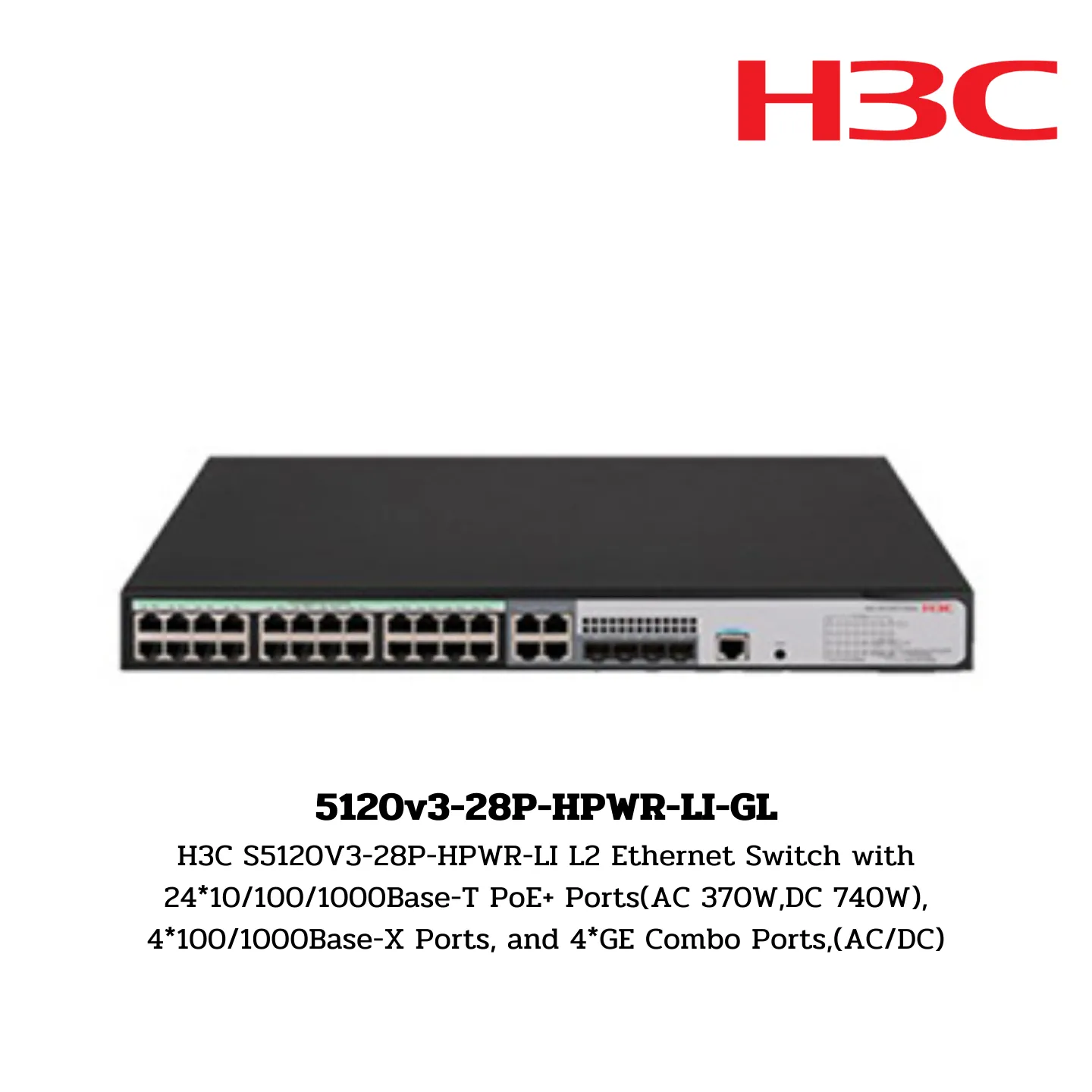 H3C S5120V3-28P-HPWR-LI L2 Ethernet Switch with 24*10/100/1000Base-T PoE+ Ports(AC 370W,DC 740W), 4*100/1000Base-X Ports, and 4*GE Combo Ports,(AC/DC)