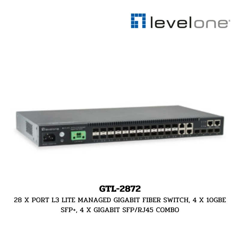 LevelOne GTL-2872 เป็นสวิตช์จัดการเลเยอร์ 3 ระดับเริ่มต้น (L3 Lite Managed) ที่ออกแบบมาเพื่อรองรับเครือข่ายความเร็วสูงเป็นพิเศษ โดยเน้นการเชื่อมต่อผ่าน Fiber Optic เป็นหลัก ประกอบด้วยพอร์ต SFP 20 พอร์ต, พอร์ต Combo (SFP/RJ45) 4 พอร์ต และพอร์ต SFP+ ความเร็วสูง 10GbE สำหรับ Uplink อีก 4 พอร์ต มาพร้อมประสิทธิภาพการส่งข้อมูล (Switching Capacity) สูงถึง 128Gbps และรองรับฟีเจอร์ขั้นสูงอย่าง IPv4/IPv6 Static Route, VLAN ที่หลากหลาย และระบบรักษาความปลอดภัยเครือข่ายที่ครบวงจร