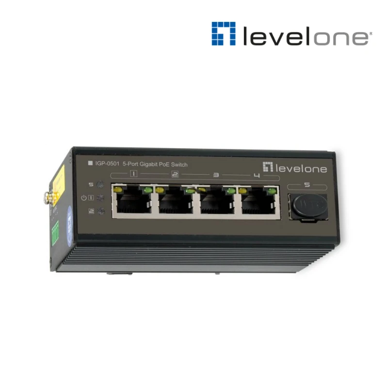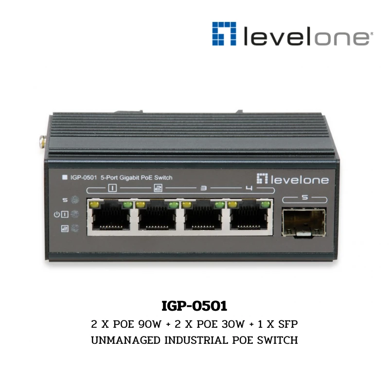 LevelOne IGP-0501 เป็นสวิตช์ PoE ระดับอุตสาหกรรมแบบ Unmanaged ที่มีความยืดหยุ่นสูงในการจ่ายพลังงาน โดยมาพร้อมพอร์ต Gigabit Ethernet จำนวน 4 พอร์ต ซึ่งพอร์ต 1-2 รองรับมาตรฐาน 802.3bt (90W) สำหรับอุปกรณ์ที่ใช้ไฟสูงมาก และพอร์ต 3-4 รองรับมาตรฐาน 802.3at (30W) พร้อมพอร์ต SFP สำหรับ Uplink อีก 1 พอร์ต ตัวเครื่องถูกออกแบบมาให้ทนทานเป็นพิเศษด้วยตัวเรือนโลหะมาตรฐาน IP40 รองรับอุณหภูมิได้กว้างและมีระบบป้องกันไฟฟ้าสถิตและไฟกระชากในตัว เหมาะสำหรับงานระบบรักษาความปลอดภัยและโครงสร้างพื้นฐานอัจฉริยะ