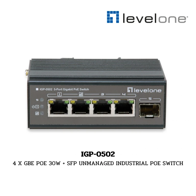 LevelOne IGP-0502 เป็นสวิตช์ PoE ระดับอุตสาหกรรม (Industrial Switch) แบบ Unmanaged ที่ออกแบบมาเพื่อความทนทานสูงสุดในพื้นที่ที่มีสภาพแวดล้อมรุนแรง มาพร้อมพอร์ต Gigabit PoE+ จำนวน 4 พอร์ต ซึ่งจ่ายไฟได้รวมสูงสุดถึง 120 วัตต์ (30 วัตต์ต่อพอร์ต) และมีพอร์ต SFP สำหรับการเชื่อมต่อไฟเบอร์ออปติกอีก 1 พอร์ต ตัวเครื่องมีขนาดกะทัดรัด รองรับการติดตั้งบนรางปีกนก (DIN-rail) และมีระบบสำรองไฟแบบ Dual Power Input เพื่อให้ระบบทำงานได้อย่างต่อเนื่องแม้แหล่งจ่ายไฟหลักมีปัญหา