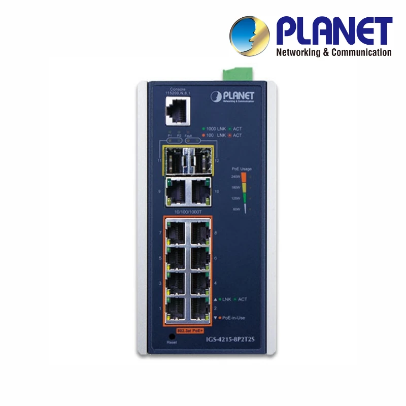 Planet IGS-4215-8P2T2S เป็น Industrial Managed Switch ระดับ Layer 2 ที่ออกแบบมาเพื่อรองรับการเชื่อมต่ออุปกรณ์จำนวนมากในสภาพแวดล้อมอุตสาหกรรม มาพร้อมพอร์ต Gigabit Ethernet ทั้งหมด 10 พอร์ต โดยแบ่งเป็นพอร์ตที่รองรับ PoE+ (802.3at) จำนวน 8 พอร์ต (Budget รวมสูงถึง 240W) และพอร์ต RJ45 ปกติอีก 2 พอร์ต นอกจากนี้ยังมีพอร์ต SFP (Fiber Optic) อีก 2 พอร์ต สำหรับการเชื่อมต่อระยะไกล ตัวเครื่องทนทานต่ออุณหภูมิวิกฤต -40 ถึง 75 องศาเซลเซียส ภายใต้มาตรฐานเคสอลูมิเนียม IP30 และรองรับเทคโนโลยี ERPS Ring เพื่อป้องกันระบบเครือข่ายล่ม