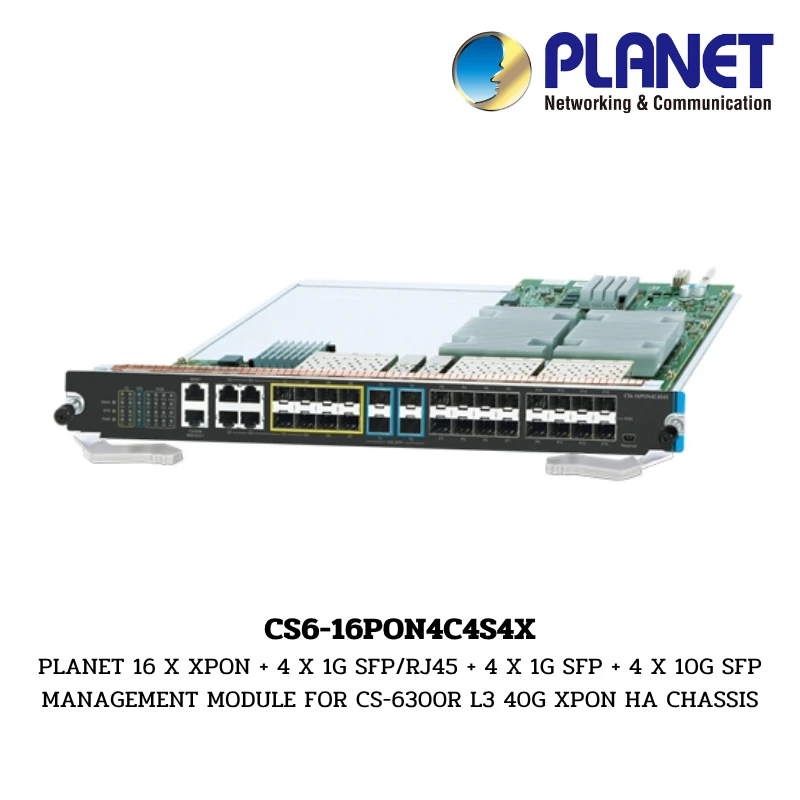 Planet CS6-16PON4C4S4X คือโมดูลบริหารจัดการและสวิตชิ่งระดับ Layer 3 ที่ออกแบบมาเพื่อใช้งานร่วมกับแชสซีสวิตช์รุ่น CS-6300R โดยเฉพาะ เพื่อสร้างระบบเครือข่ายใยแก้วนำแสงความเร็วสูง (FTTx) โมดูลนี้โดดเด่นด้วยพอร์ต xPON จำนวน 16 พอร์ต ที่รองรับการเชื่อมต่ออุปกรณ์ปลายทาง (ONU) จำนวนมาก พร้อมพอร์ตคอมโบและพอร์ต Uplink ความเร็ว 10G SFP+ อีก 4 พอร์ต รองรับสถาปัตยกรรมแบบ High Availability (HA) ด้วยระบบ Dual Master Control Redundancy ช่วยให้โครงข่ายพื้นฐานระดับองค์กรหรือผู้ให้บริการอินเทอร์เน็ตทำงานได้อย่างต่อเนื่องและมีเสถียรภาพสูงสุด
