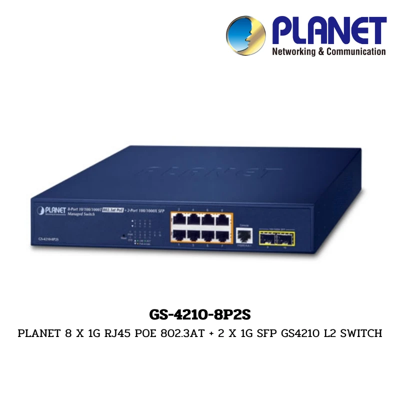 Planet GS-4210-8P2S เป็น Managed PoE+ Switch รุ่นยอดนิยมที่ออกแบบมาเพื่อความเงียบและประสิทธิภาพสูงด้วยดีไซน์ Fanless (ไม่มีพัดลม) เหมาะสำหรับติดตั้งในสำนักงานหรือพื้นที่ที่ต้องการความสงบ มาพร้อมพอร์ต Gigabit Ethernet 8 พอร์ตที่จ่ายไฟ PoE+ (30W) และพอร์ต SFP แยกต่างหาก 2 พอร์ต สำหรับการเชื่อมต่อ Uplink ระยะไกลผ่านไฟเบอร์ออปติก รองรับการจัดการเครือข่ายอัจฉริยะทั้งระบบสำรอง ERPS Ring และการตรวจสอบอุปกรณ์ปลายทางอัตโนมัติ (PD Alive Check)