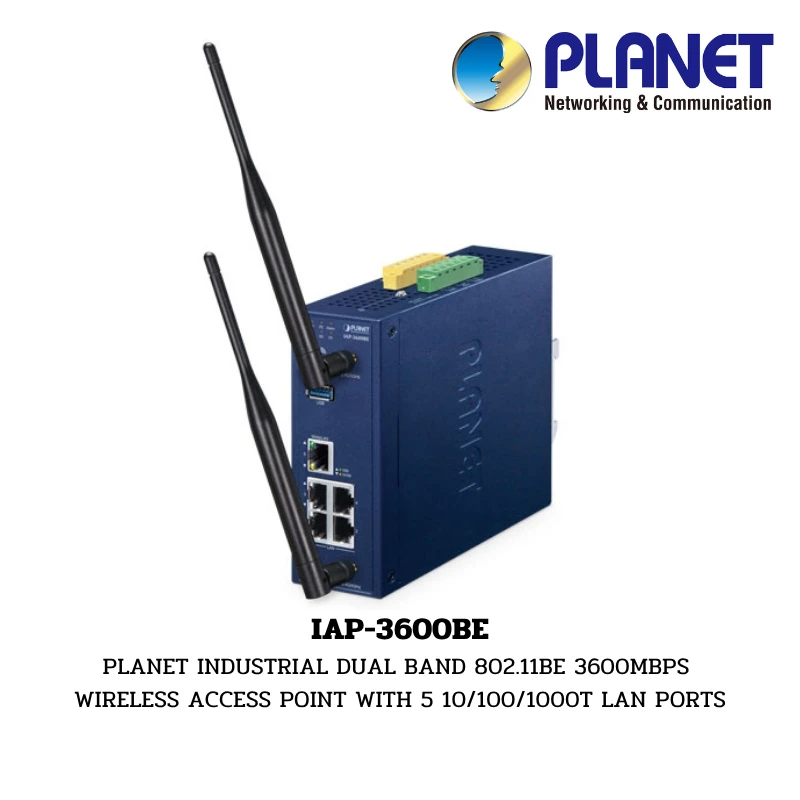 Planet IAP-3600BE เป็นแอคเซสพอยต์อุตสาหกรรมรุ่นล้ำสมัยที่รองรับมาตรฐาน Wi-Fi 7 (802.11be) มอบประสบการณ์การเชื่อมต่อไร้สายที่เหนือกว่าด้วยความเร็วรวมสูงสุดถึง 3600Mbps จุดเด่นอยู่ที่การใช้เทคโนโลยี 4096-QAM และช่องสัญญาณกว้างสูงสุด 160MHz ทำให้การรับส่งข้อมูลรวดเร็วและมีประสิทธิภาพมากกว่า Wi-Fi รุ่นก่อนหน้า ตัวเครื่องออกแบบมาเพื่อความทนทานในระดับ Industrial Grade รองรับอุณหภูมิทำงานได้กว้างตั้งแต่ -40 ถึง 70 องศาเซลเซียส มาพร้อมพอร์ต Gigabit LAN 5 พอร์ต และฟังก์ชันการจัดการที่ครบครัน เหมาะสำหรับงานอุตสาหกรรมที่ต้องการแบนด์วิดท์สูงมากและความหน่วงต่ำพิเศษ เช่น ระบบภาพเสมือนจริง (VR/AR) ในการผลิต หรือหุ่นยนต์อัตโนมัติความเร็วสูง