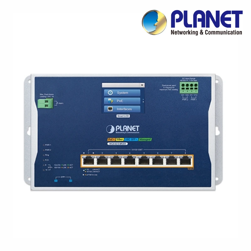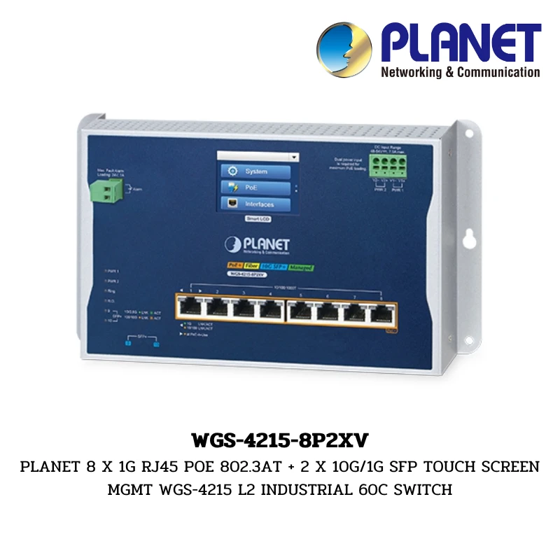 Planet WGS-4215-8P2XV เป็นนวัตกรรม Industrial Managed Switch ดีไซน์แบบ Flat-type ที่ล้ำสมัยด้วยหน้าจอ TFT Color Touchscreen ขนาด 2.4 นิ้ว ช่วยให้ผู้ดูแลระบบสามารถตรวจสอบสถานะและตั้งค่าพื้นฐานได้ทันทีที่หน้าเครื่อง มาพร้อมพอร์ต Gigabit PoE+ 8 พอร์ต และพอร์ต 10G SFP+ Uplink 2 พอร์ต รองรับงบประมาณไฟสูงสุด 288W และฟีเจอร์ Layer 3 Static Routing ออกแบบมาเพื่อการติดตั้งบนผนังในสภาพแวดล้อมอุตสาหกรรมที่ต้องการความคล่องตัวสูงในการบำรุงรักษา