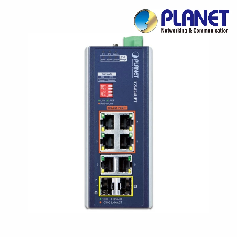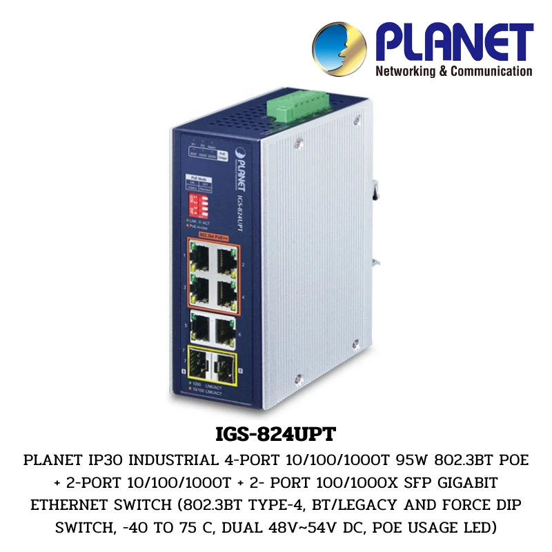 (IGS-824UPT) PLANET IP30 INDUSTRIAL 4-PORT 10/100/1000T 95W 802.3BT POE + 2-PORT 10/100/1000T + 2- PORT 100/1000X SFP GIGABIT ETHERNET SWITCH (802.3BT TYPE-4, BT/LEGACY AND FORCE DIP SWITCH, -40 TO 75 C, DUAL 48V~54V DC, POE USAGE LED)