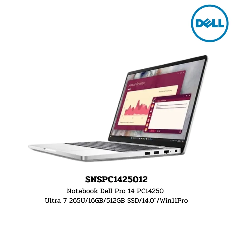 Dell Pro 14 (PC14250) รุ่นนี้ยกระดับความแรงด้วยโปรเซสเซอร์ Intel Core Ultra 7 265U ที่ทำความเร็วได้สูงสุดถึง 5.3 GHz พร้อม NPU 11 TOPS สำหรับงาน AI โดยเฉพาะ มาพร้อมแบตเตอรี่ที่ใหญ่ขึ้นเป็น 55Wh บนหน้าจอขนาด 14.0 นิ้ว WUXGA (16:10) จอกันแสงสะท้อน จุดเด่นคือความครบเครื่องของพอร์ตเชื่อมต่อมาตรฐานธุรกิจที่มีทั้ง Thunderbolt 4 และพอร์ตแลน RJ-45 เสริมความปลอดภัยด้วยกล้อง FHD + IR รองรับการสแกนใบหน้า และระบบปฏิบัติการ Windows 11 Pro
