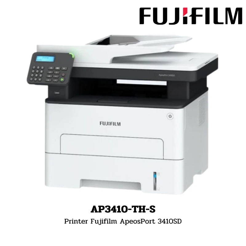 เครื่องพิมพ์มัลติฟังก์ชันเลเซอร์ขาวดำ (4-in-1) จาก FUJIFILM รุ่น ApeosPort 3410SD ที่รวมฟังก์ชัน Print, Scan, Copy และ Fax ไว้ในตัวเครื่องขนาดกะทัดรัด ประมวลผลรวดเร็วด้วย CPU 1 GHz และหน่วยความจำ 512 MB มอบความเร็วในการพิมพ์สูงถึง 34 ppm พร้อมระบบพิมพ์สองหน้าอัตโนมัติ (Auto Duplex) รองรับการเชื่อมต่อที่หลากหลายทั้ง Wi-Fi, Ethernet และ USB 2.0 สามารถพิมพ์ลงบนกระดาษที่มีความหนาได้สูงสุดถึง 200 gsm เหมาะสำหรับสำนักงานหรือการใช้งานในบ้านที่ต้องการความครบเครื่องและประสิทธิภาพในหนึ่งเดียว มั่นใจด้วยการรับประกันยาวนาน 3 Years