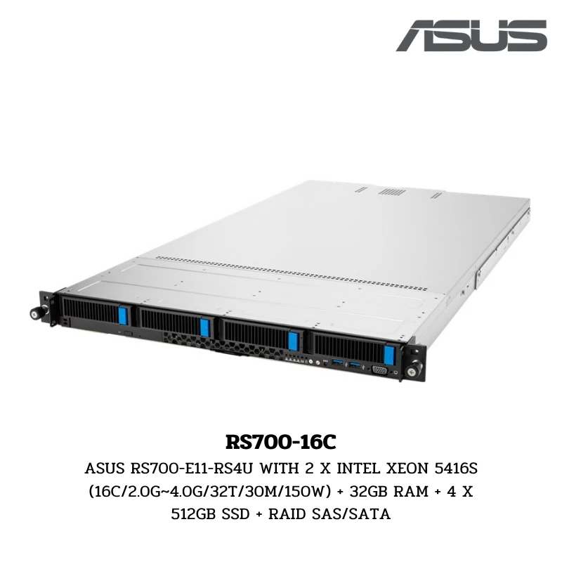 (RS700-16C) Server Asus RS700-E11-RS4U WITH 2 X INTEL XEON 5416S (16C/2.0G~4.0G/32T/30M/150W) + 32GB RAM + 4 X 512GB SSD + RAID SAS/SATA