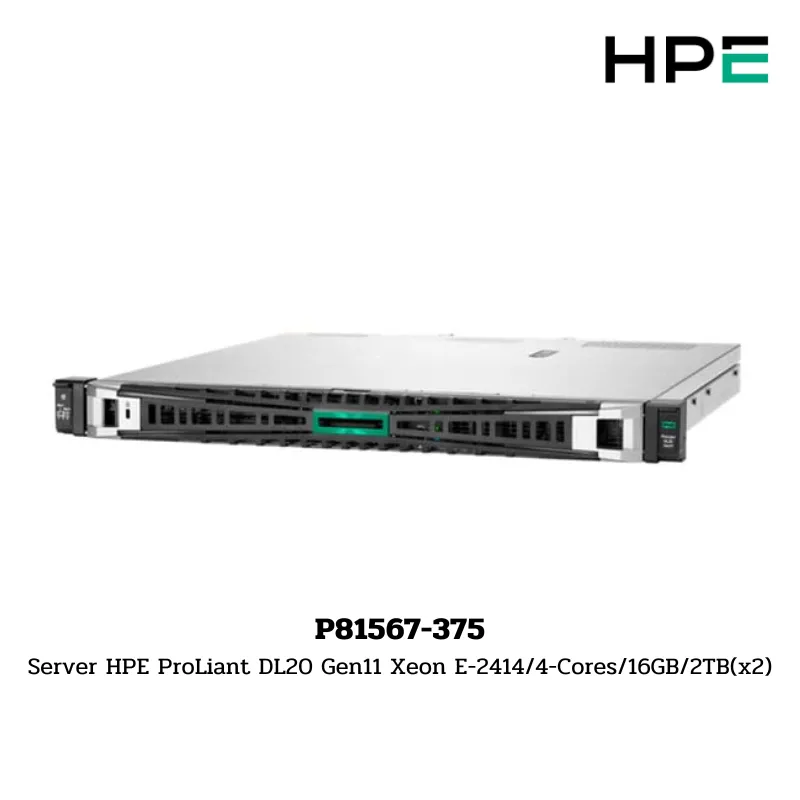 HPE ProLiant DL20 Gen11 รหัส P81567-375 เซิร์ฟเวอร์แบบ Rack 1U ที่มาพร้อมโซลูชันพร้อมใช้งาน (Ready-to-go) โดยติดตั้งฮาร์ดดิสก์ 2TB จำนวน 2 ลูก มาให้ในตัว ขับเคลื่อนด้วยหน่วยประมวลผล Intel Xeon E-2414 และแรม DDR5 รุ่นใหม่ เหมาะสำหรับธุรกิจที่ต้องการความคุ้มค่าและประหยัดพื้นที่ในตู้ Rack พร้อมการรับประกันแบบ Smart Choice Service