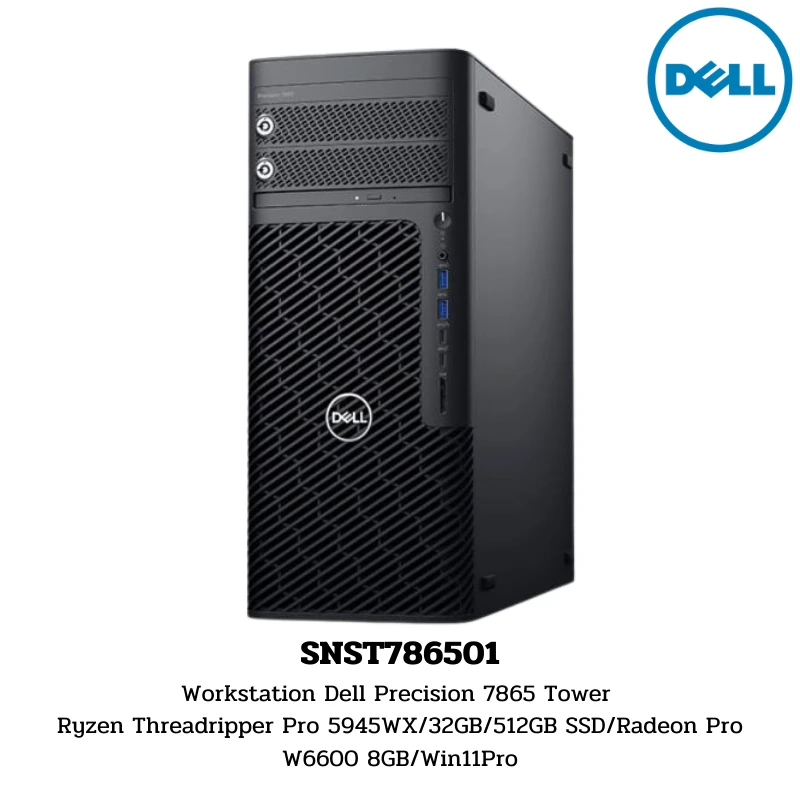 (SNST786501) Workstation “Dell” Precision 7865 Tower เวิร์กสเตชันระดับ Ultra-High End ขับเคลื่อนด้วยขุมพลัง AMD Ryzen Threadripper PRO 5945WX พร้อมแรม 32GB DDR4 ECC และหน่วยความจำ 512GB SSD เสริมพลังด้วยกราฟิกการ์ด AMD Radeon Pro W6600 8GB พร้อม Power Supply สูงถึง 1350W รองรับระบบปฏิบัติการ Windows 11 Pro และการรับประกัน 3 Years Pro Support