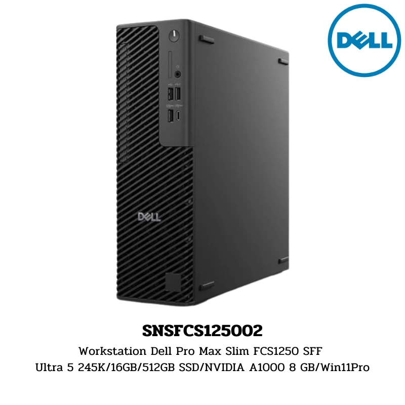 Dell Pro Max Slim FCS1250 รหัส SNSFCS125002 เวิร์กสเตชันรูปแบบ Small Form Factor (SFF) ที่ทรงพลังด้วยหน่วยประมวลผล Intel Core Ultra 5 245K มาพร้อมแรม 16GB DDR5 ECC และหน่วยความจำ 512GB SSD เสริมประสิทธิภาพกราฟิกด้วย NVIDIA A1000 8 GB รองรับระบบปฏิบัติการ Windows 11 Pro และการรับประกัน 3 Years Pro Support